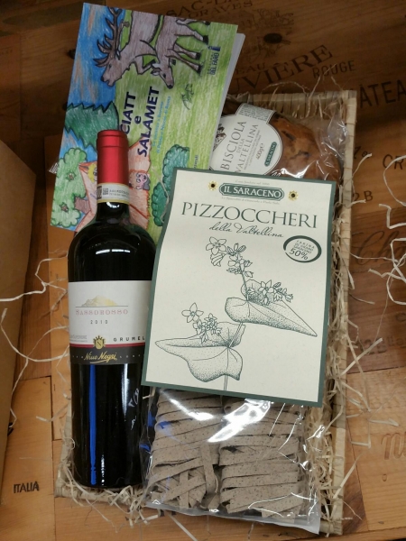 La tradizionale confezione regalo con i prodotti tipici della Valtellina si arricchisce ora del libro SCIATT E SALAMET scritto nel 2016 dagli alunni della Scuola Primaria Martino Anzi di Bormio.